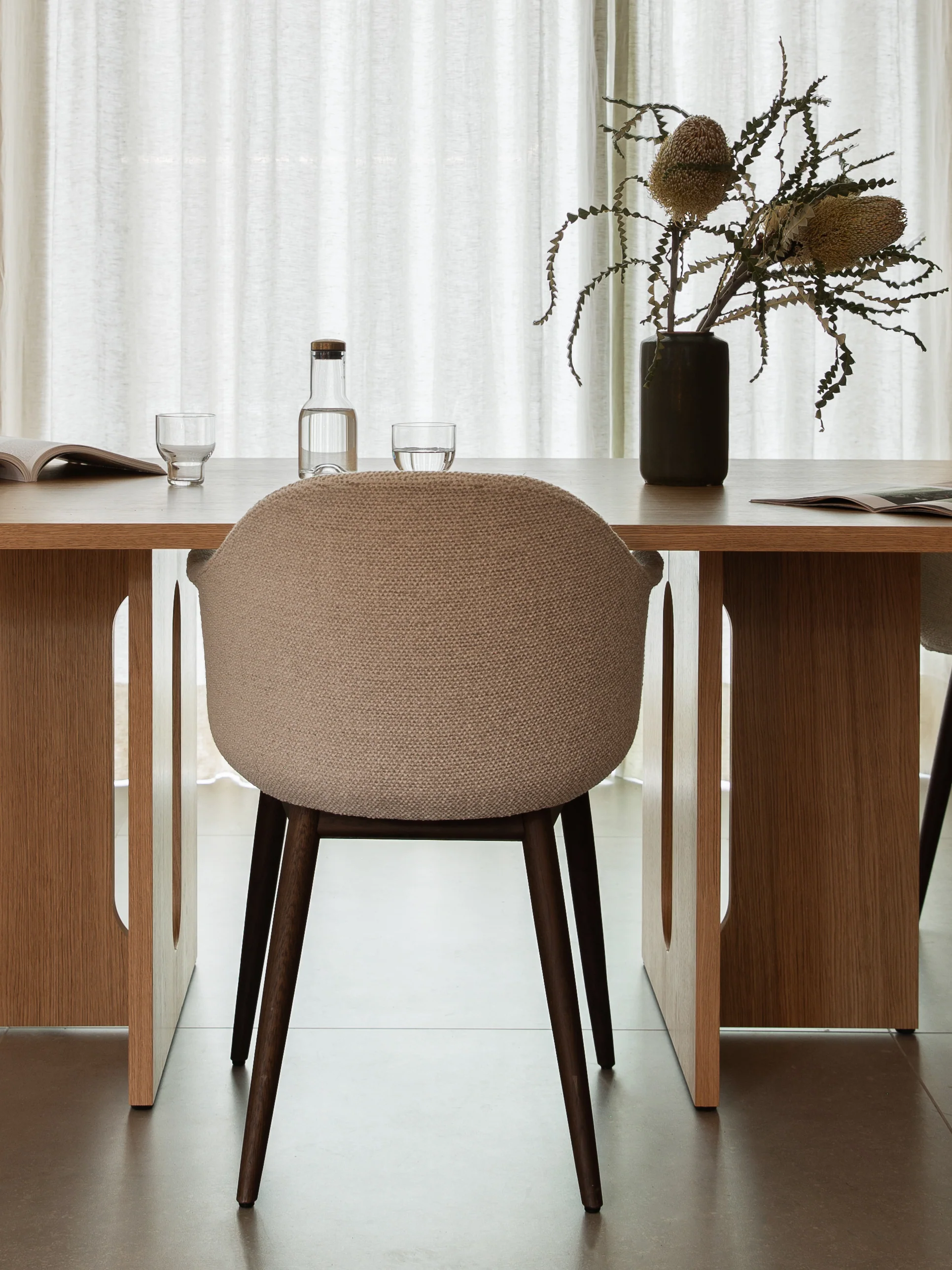 Audo’s Androgyne Collection is distinguished by its playful, yet elegant silhouette and considered combination of natural materials. The invention of the Copenhagen-based Norwegian architect and designer Danielle Siggerud, its blend of the masculine and feminine – true androgyny – is what lends the collection its name. Like a magnificent monument, the new Androgyne Dining Table pairs oak and stone to striking effect. The bold and confident take on a dining table amplifies the silhouette of the collection’s popular side table to grander proportions thanks to an elegant oak base – available in natural or dark stained – and a table top in corresponding wood or kunis breccia, an artistic blend of stones in warm tones that create subtle texture and add a new dimension to the design. A table not for the faint of heart, it makes a characterful accent in any space – from a domestic dining room to a modern restaurant or office gathering point – and serves multiple functions to bring a timeless quality to the design. “The Androgyne Collection has always been about honouring perfectly executed joinery and celebrating natural materials. The use of rich, warm oak makes it easy to pair the dining table with any interior style, and the wood will age gracefully over time. I envisage the table in a home space, as a natural gathering point that allows people to come together in different ways.” – Danielle Siggerud