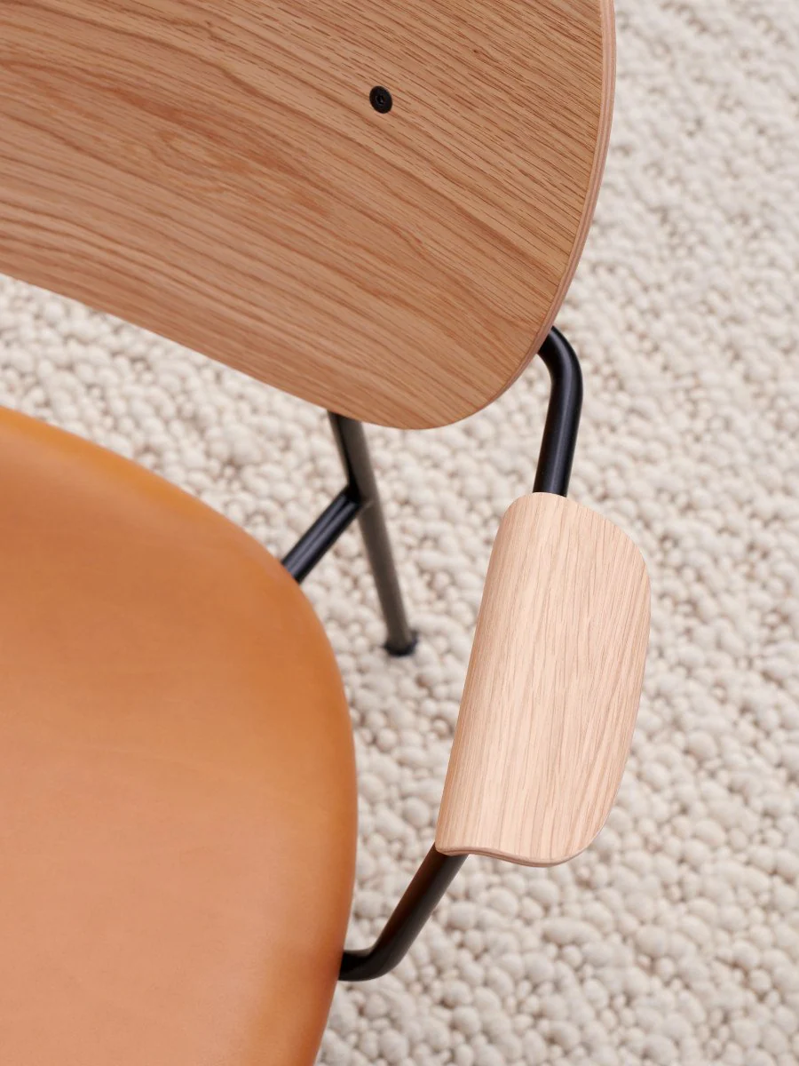 Co Lounge Chair is a lightweight lounger with exceptional sitting comfort. Inspired by classic designs that combine metalwork and woodwork to iconic effect, the new iteration purposefully re-spaces its different components to create a lighter, more laid-back look than its dining predecessor. The comfortable design enhances interior spaces rather than demanding attention in a room. The form-pressed wood veneer backrest is angled for comfort and the curved armrests and upholstered seat support and embrace the body. The slender powder-coated steel frame belies its strength, providing a stable and sleek foundation on which to stand. Fully customizable, it melds beautifully with its surroundings — whether at home in a cosy living room corner or placed in a hotel lobby or office reception.
