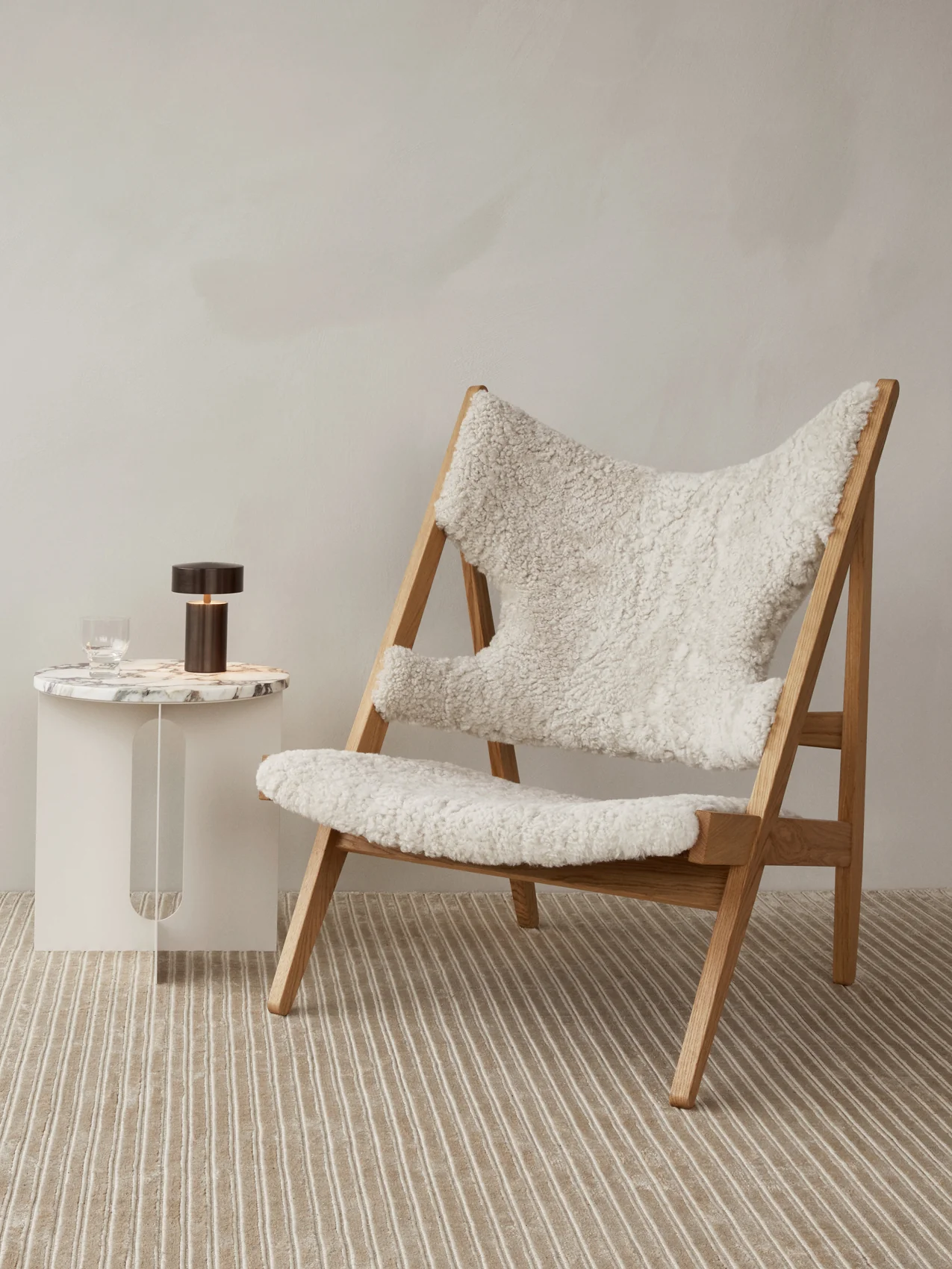 The Knitting Chair is beautiful from every angle, making it easy to place anywhere in a room. Given the chair’s enveloping comfort, it has a relatively small footprint, which makes it an easy fit in compact interiors as well as in more spacious ones. The design also stands out on comfort, the result of Kofod-Larsen’s constant care to ensure ideal angles and lumbar support. The clean, sculptural lines, achieved through the designer’s close work with joiners, and the high-end, natural materials make for an unforgettable, conversation-sparking silhouette.