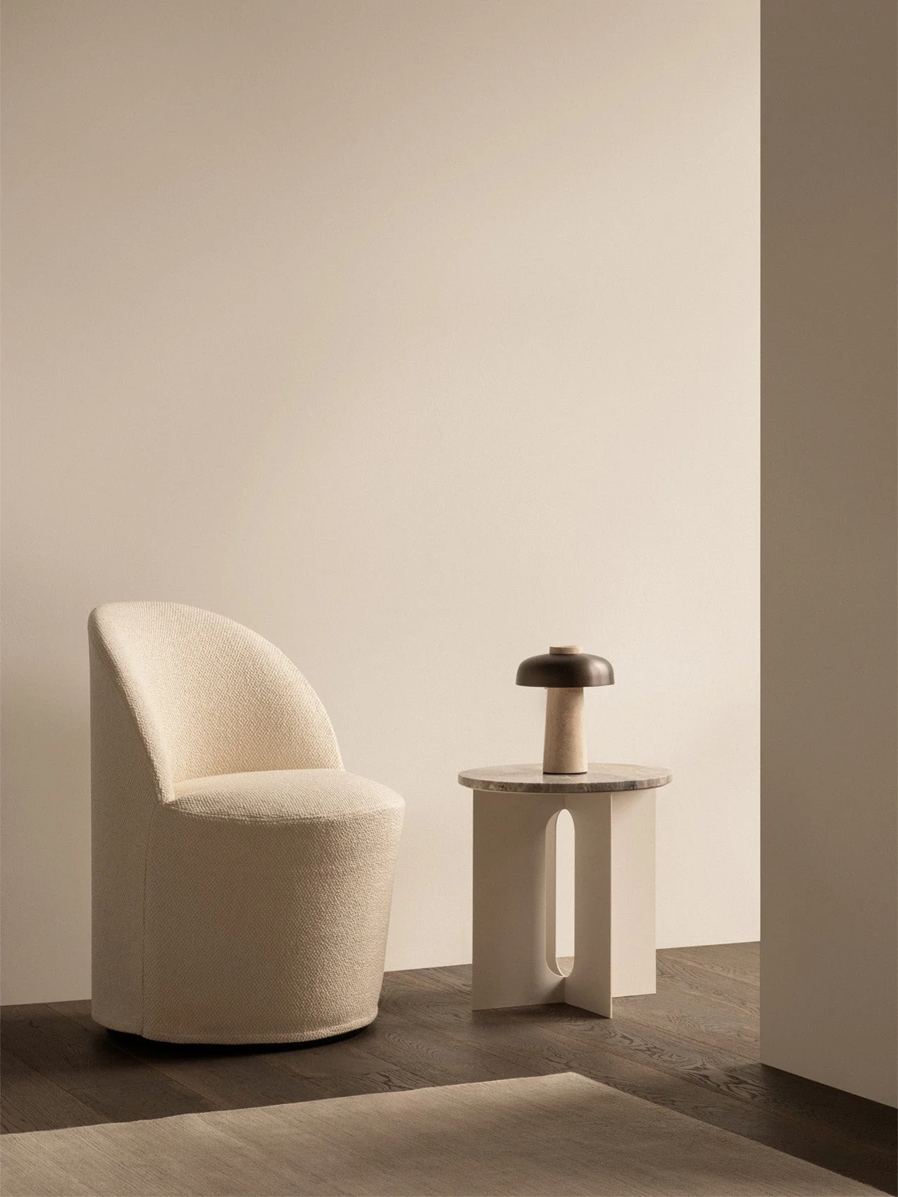 The portable iteration of the Reverse Table Lamp masterfully combines raw and refined elements, drawing inspiration from the structural play of geometric constraints. The conical base is made from untreated stone, with natural imperfections that highlight its organic beauty. The base is complemented by a curved, bronzed aluminum shade with a smooth, polished finish, creating a striking contrast of textures. An opal diffuser provides soft, even light, ideal for creating a warm atmosphere in any setting. With a dimmer switch adjustable to three brightness settings, the lamp offers flexibility for different lighting needs. IP44-approved, it is suitable for use in wet rooms and outdoor spaces. To ensure longevity, it should be stored indoors when not in use.