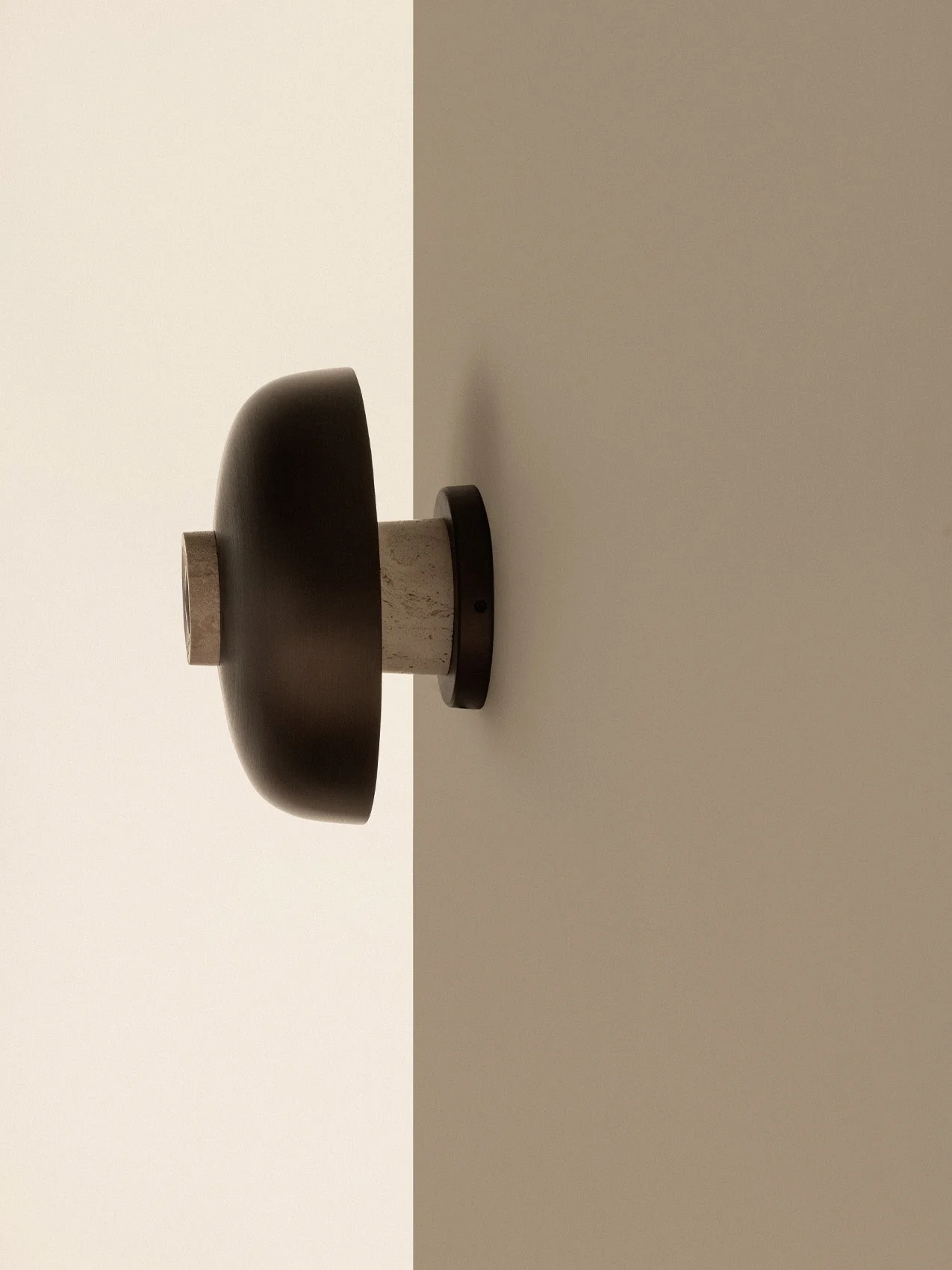 A striking fusion of raw, natural materials and refined craftsmanship, the Reverse Wall Lamp is inspired by both the tension and harmony created by geometric constraints. The lamp’s wall mount is crafted from untreated travertine stone, shaped into a conical form with natural imperfections that celebrate the beauty of organic textures. In contrast, the curved shade is made from anodized bronzed aluminum with a smooth finish for a polished touch. The lamp features an opal diffuser for even light diffusion and a warm, ambient glow. This lamp is hardwired into the wall with either a rotary dimmer found on the fixture or there is a version that is compatible with TRIAC dimmer system, the standard for home dimmer systems.
